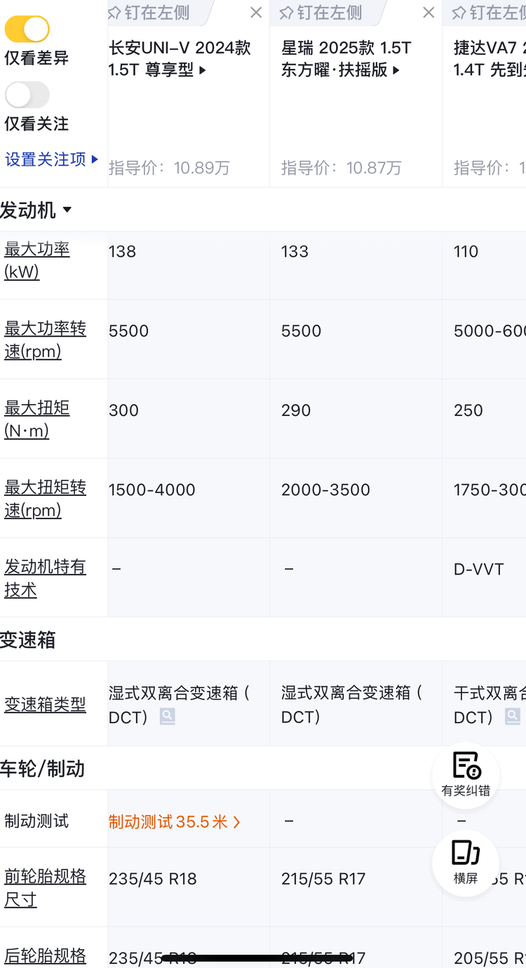 先看动力方面,捷达VA7的1.4T发动机最大功率是150马力,东方曜扶摇版的1.5T发动机是181马力,UNI-V尊享型的1.5T发动机是188马力。捷达VA7的整备质量为1361公斤,东方曜扶摇版是1490公斤,UNI-V尊享型是1415公斤。它们分别推重比分别是11.02%、12.14%和13.28%,在动力方面捷达VA7不占优势,车最轻,推重比最低,这从0—100公里/小时的加速时间也能看出来。东方曜扶摇版和UNI-V尊享型都有车道边车道偏离碰撞预警和车道保持车道居中这些L2级的辅助驾驶,而捷达VA7是没有的,并且捷达VA7没有360的全景影像和自适应巡航。