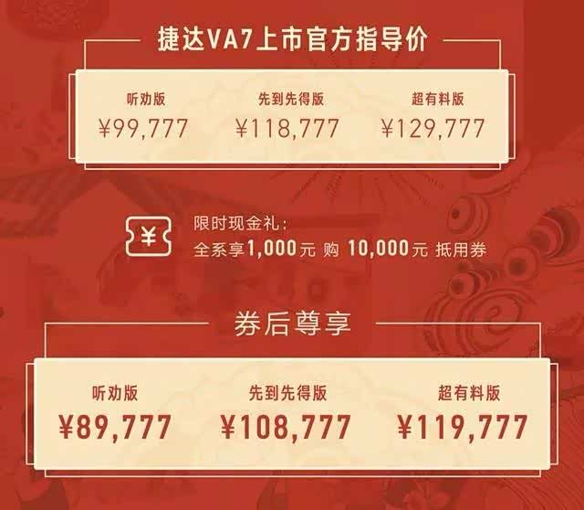 1月12日,吊了消费者3个月胃口的捷达VA7正式上市,新车指导价格区间为9.9777万—12.9777万元。同时,新车全系享1000元购10000元抵用券,券后价格区间为8.9777万—11.9777万元。