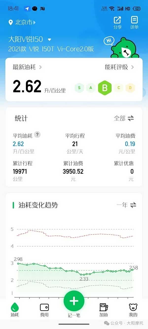 我的这辆车在两万公里的用车时间里,油耗是我比较满意的一点,两万公里的平均油耗是百公里2.62L,在一众150踏板的油耗里算是比较低的。