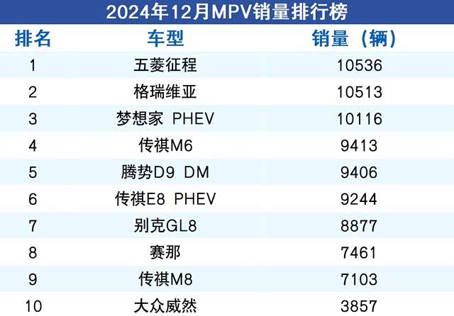在2024年12月的MPV销量数据出炉后,让很多人意想不到的是第一名居然被五菱夺下,五菱征程凭借10536辆的销量成绩成为12月销冠,赶超丰田格瑞维亚、岚图梦想家、传祺M6、腾势D9等一众车型。