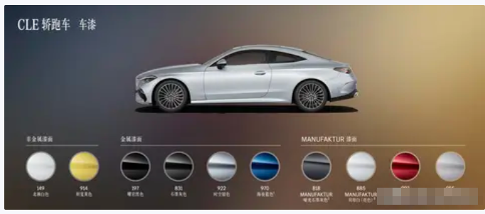 在车辆的颜色选择上,新款奔驰CLE为用户带来了众多的选项。消费者有多种选择,包括非金属漆面(例如北极白色和炽夏黄色),金属漆面(涵盖曜宕黑色、石墨灰色、时空银色和海夜蓝色),以及MANUFAKTUR漆面(例如哑光石墨灰色、贝母白、熔岩红色金属漆和远峰灰色非金属漆),以满足他们个性化的需求。