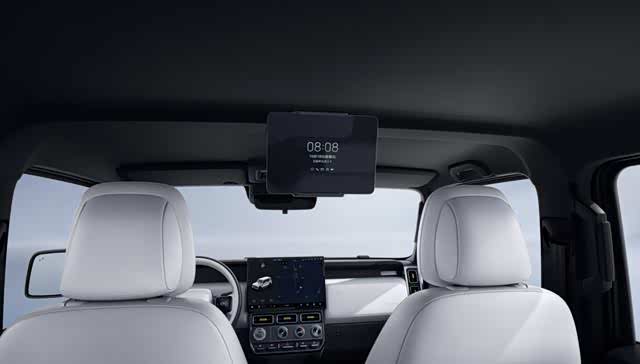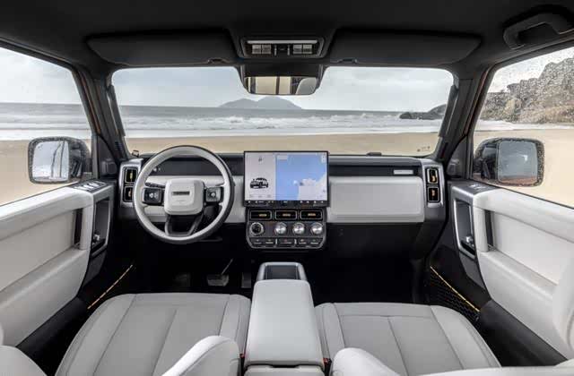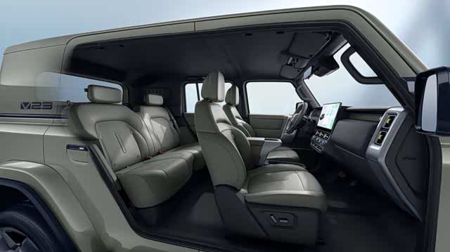 奇瑞iCAR V23的内饰设计也别具一格,整车采用了浅米色+黑色的配色,大面积软性材质的包裹,粗糙的黑色荔枝纹塑料装饰面板,大量的物理按键和旋钮设计,并且旁边还可以看到裸露的铆钉,也将越野车的粗犷气息展现了出来。科技感方面,该车配备了15.4英寸2.5K中控屏,为了让车内变得更加简约,取消了仪表盘,取而代之的是AR-HUD抬头显示系统。搭载高通骁龙8155芯片,支持CarPlay、车联网、语音控制。配置方面,新车全系标配手机蓝牙钥匙、NFC卡片钥匙、自动空调、PM2.5过滤装置、前排双层夹胶隔音玻璃、高速NOA高阶智驾,采用地平线J3+TDA4方案、燕飞利仕音响、手机无线充电板,内置行车记录仪、360度全景影像与透明底盘等配置。