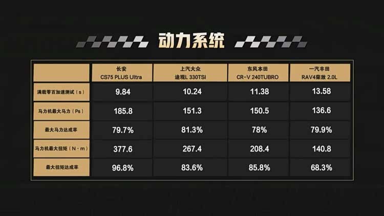 从这场动力对决中可以看出,长安第四代CS75 PLUS Ultra凭借其强劲且高效的动力系统,全面超越了其他三款车型。无论是满载零百加速测试、最大马力、还是最大扭矩,长安第四代CS75 PLUS Ultra都表现得相当出色,尤其是在扭矩输出和扭矩达成率上,几乎无可匹敌。其精准的动力调校和高效的动力传递,也使得长安第四代CS75 PLUS Ultra在各类路况下都能提供充沛的动力支持,驾驶者的操控体验更为顺畅舒适。