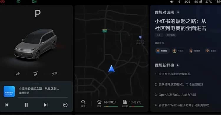 在智能座舱方面,基座大语言模型MindGPT迭代升级为MindGPT-3o,进一步提升理想同学的任务助手、认知成长和情感陪伴能力。新增AI任务大师单次版,用户可以语音或手动创建单次任务。理想同学工作流功能开启时,副驾屏将显示工作流界面,展示思考推理及处理过程。理想汽车也成为行业首家将AI语音助手工作原理可视化的车企。智能座舱和理想同学App上新了理想同学播客功能,包含理想对话间、理想新鲜事两项细分功能。理想对话间将深度长文拆解成两人对话形式的播客,让用户在碎片化时间里丰富知识储备。理想新鲜事支持每日推送精品话题讨论与热点资讯。
