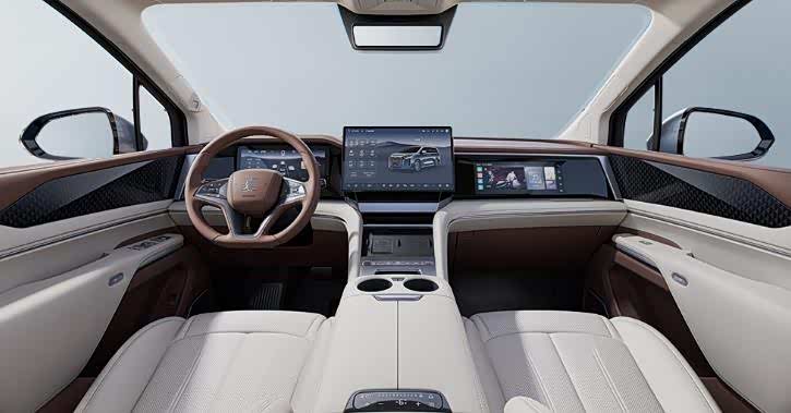 坐进驾舱,5系的中控给人以科技、简约的风格。在中控台几乎看不到实体按键的存在,当下流行的曲面一体屏幕代替了按键。车机采用8155P芯片,提供丰富第三方软件下载和360全景影像。5系还提供后排巨幕选装,31.3英寸的4K屏幕续加价3.38万元。