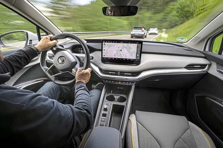 由此获得的增益并非纸上谈兵:斯柯达从静止加速到100公里/小时仅需6.6秒,而我们最近测试的Enyaq Coupé 80(204马力)则需要8.3秒。此外,这种新的动力感受也体现在驾驶者的感受上。驾驶者手握着触感极佳带有经典按键和旋钮的方向盘,身体与座椅完美契合。由于扭矩的大幅提升,超车的动作变得更加轻松自如。而在高速公路上加速时,斯柯达的最高车速也从之前的160公里/小时提升到了180公里/小时。