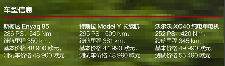 整体表现也令人印象深刻。在节能模式下,Model Y的续航里程比斯柯达多出50公里,而测得的512公里的表现也是可以接受的。如果让它全力以赴,耗电量会大大增加。但即便如此,Model Y仍有自己的优势:从100公里/小时加速到180公里/小时,它比斯柯达快了11秒,甚至当Enyaq(与加速相对温和的沃尔沃一样)在180公里/小时限制加速时,Model Y还能加速。Model Y能够轻松地实现217公里/小时的车速,仿佛可以持续这一速度数小时。