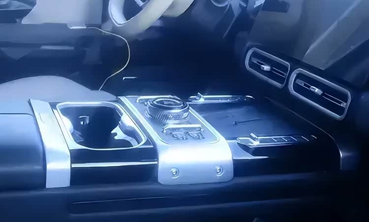 副仪表台是桥鞍式的,上面有机械旋钮和按键,还有银色饰板和裸露的内六角螺丝,强调这车的“硬派越野”风格。银色饰板前面有个储物槽,估计有手机无线充电功能。