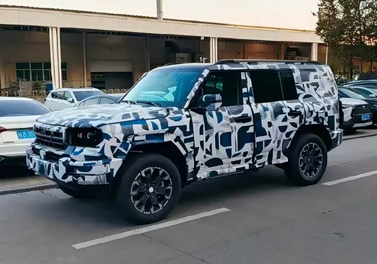 新车的侧面造型跟路虎揽胜有点像,车顶线条有点溜背的感觉。侧柱可能是熏黑的,营造出悬浮式车顶的效果,车顶还有行李架。