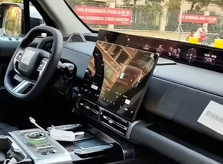 车内也是硬派越野风格,跟外观很搭。有三辐式平底多功能方向盘,还有个大尺寸的悬浮式中控屏。中控台上面还有个贯穿式显示屏,估计是显示导航和车辆信息的。