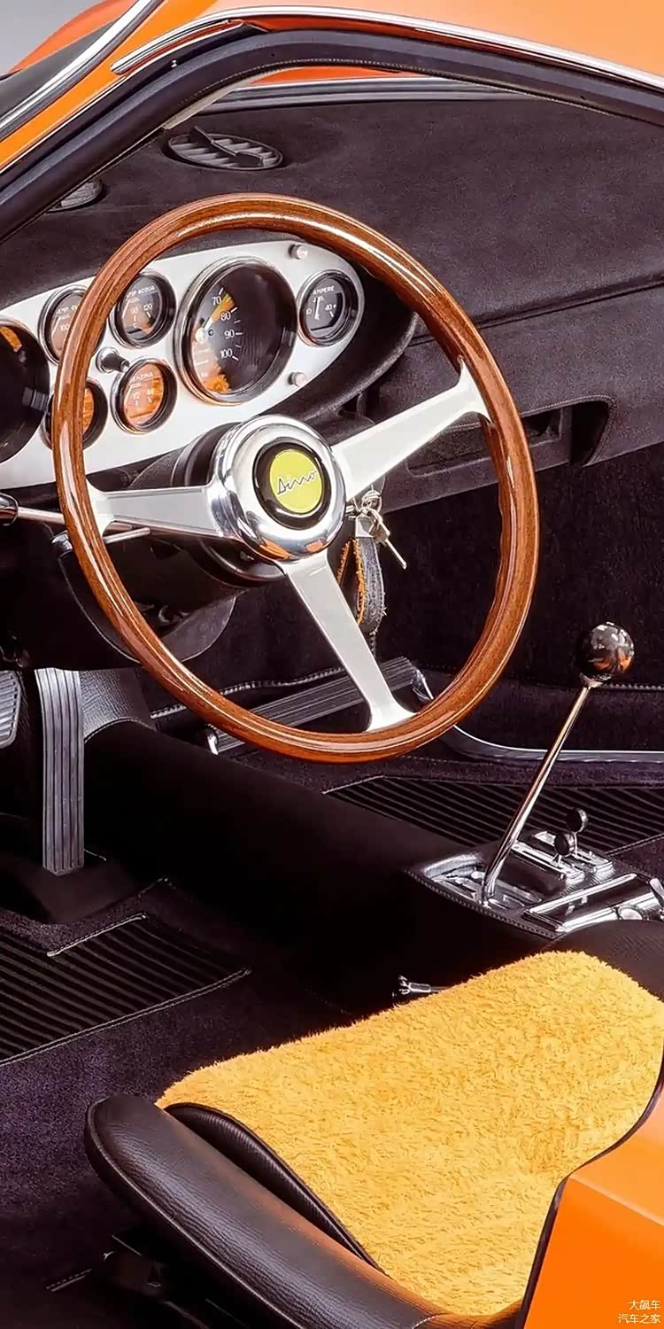 进入车内,法拉利Dino 206 GT的内饰设计相对简约,但每一个细节都体现了法拉利对品质的追求。车内配备了木质装饰和金属饰条,进一步提升车内的豪华感。座椅采用了高级皮革材质,提供了卓越的支撑性和舒适性,同时搭配了经典的法拉利红色装饰,彰显了车辆的运动气质。仪表盘采用了经典的圆形仪表设计,简洁而直观,为驾驶者提供了清晰的驾驶信息。这种豪华与运动的结合,成为了Dino 206 GT内饰设计的最大亮点。