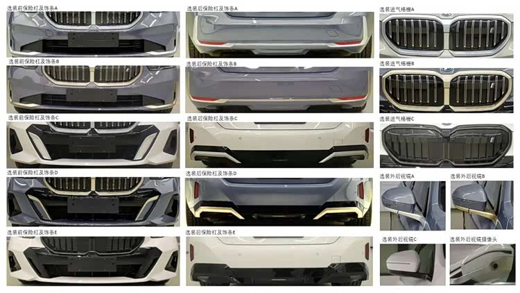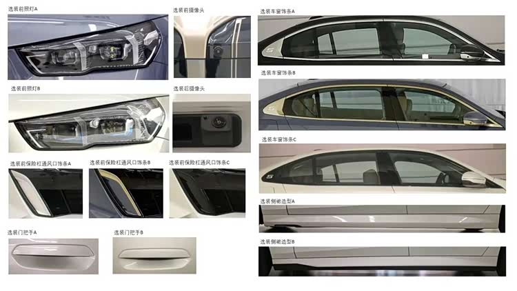 从公示的第一张照片我们可以看到,除了此前我们熟知的前后保险杠与饰条造型(A、B、C、D),此次新增加了E选项,黑色高光的设计看起来更具运动气息。同时,进气格栅与外后视镜也新增了C选项,大面积的熏黑处理,营造出深邃且犀利的视觉效果。