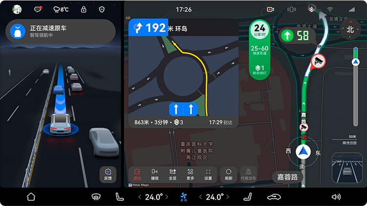 新增智驾环境渲染中的侧向防碰撞/剐蹭风险提示功能,当侧向障碍物距离车身过近时,车辆侧方会立即显示红色警示,及时提醒用户注意侧向剐蹭风险。