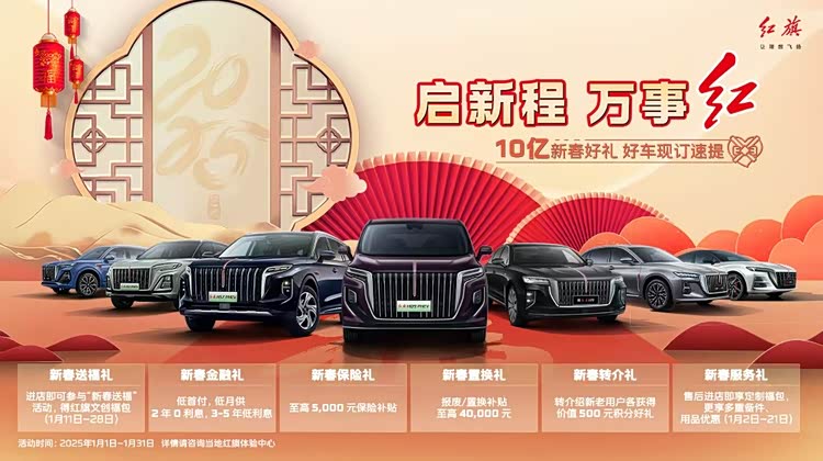 同时官方还提供了旗享置换礼:报废/置换补贴,品牌补贴至高 8000元;旗享金融礼:低首付,低月供,2年0利息,3-5年低利息;旗享保险礼:2000元保险补贴;新春送福礼:进店即可参与“新春送福”活动,得红旗文创福包(1月11日~28日);新舂转介礼以及新春服务礼售后进店即享定制福包,等诸多购车政策,相当有诚意。