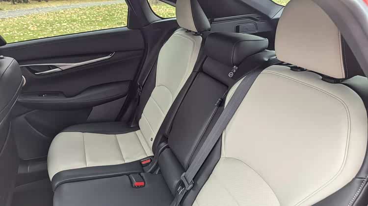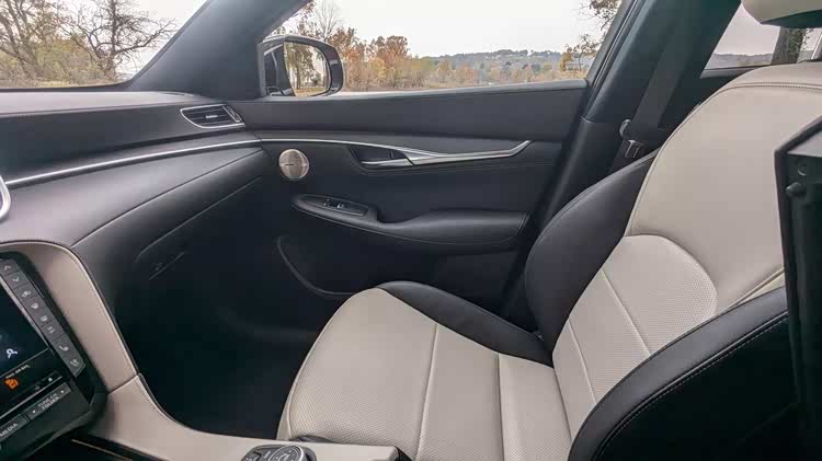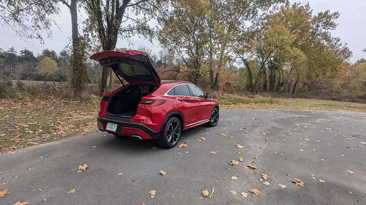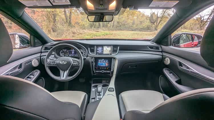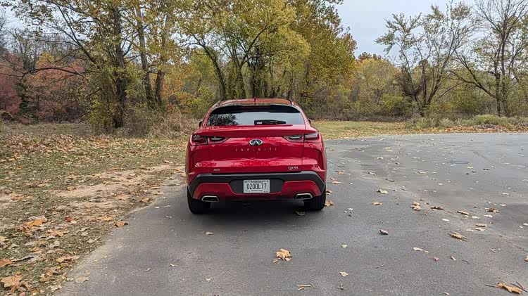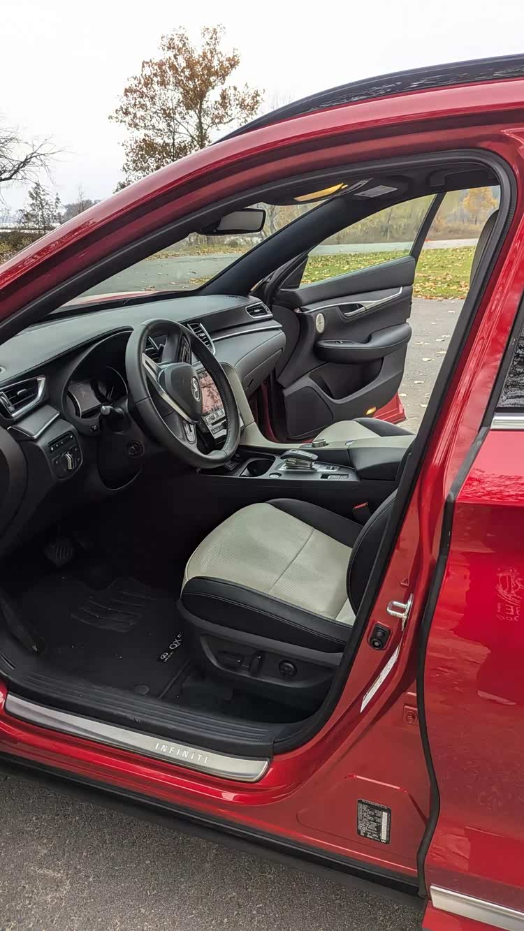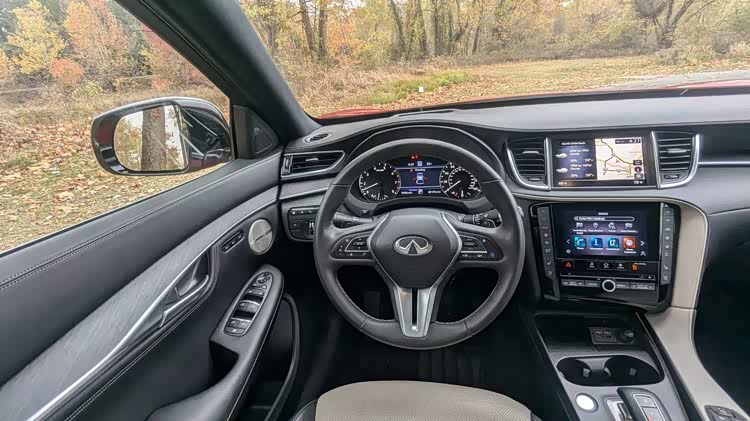 车尾部分,不算非常大掀背的尾门有着大尺寸的车顶扰流板,小巧的尾窗承担不了多少视野任务,尾箱盖末端有着翘起的鸭尾,扁平的尾灯组有着犀利的双弯折红色灯带,显得相当的运动。尾箱线条在后保险杠部分再度突出,加入了双边双出排气装饰,让整车的设计画下圆满的句号。在内饰部分,当然是熟悉的英菲尼迪家族风格,上一个时代的双嵌式大屏设计,有着独特的视觉效果,环抱式的中控台面层感丰富,大面积皮革缝线工艺覆盖,彰显了豪华感。