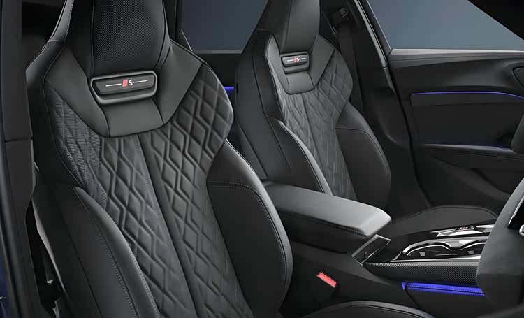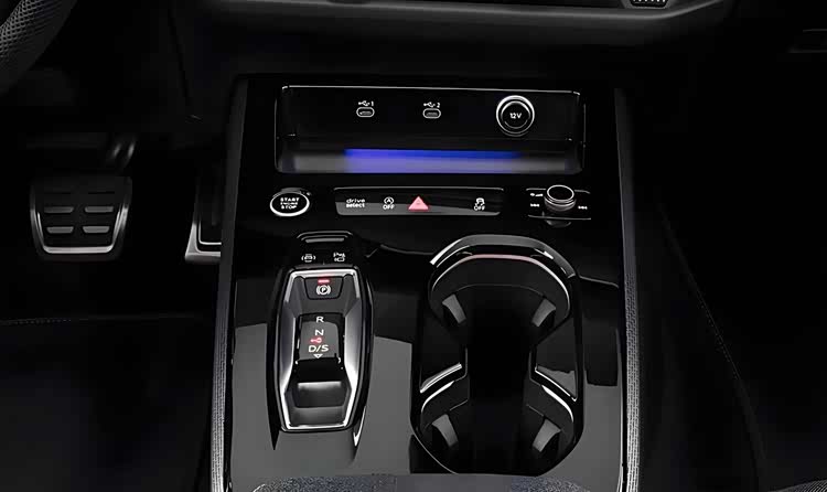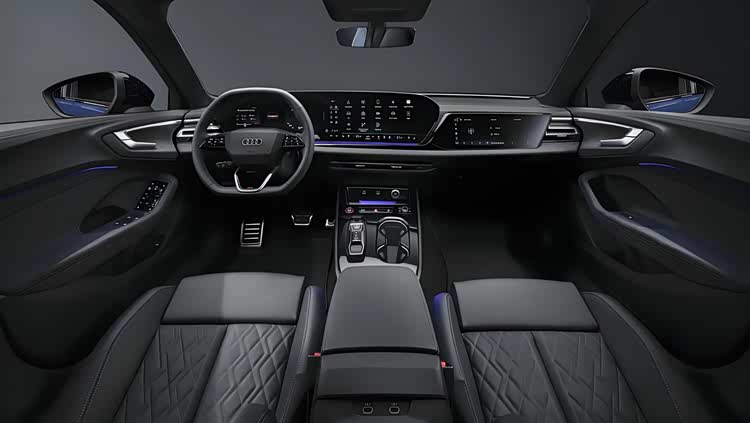 内饰的也采用了奥迪RS性能车同样的大面积黑色真皮材质和黑灰色Alcantara面料的交替铺陈,搭配 Crimson Red 红色缝线和红色安全带,就连车顶和地毯也都采用了黑灰色的Dinamica材质包裹。中控台采用了全新的布局,中控台配备异型多功能方向盘、操控岛的区域更加简约凝练,配备了按键式换挡机构,两个标准尺寸的杯架以及点烟器、USB接口、Type-C接口以及醒目的一键启动按钮。科技感方面,该车配备了OLED曲面双联屏设计,由11.9英寸全液晶显示屏+14.5英寸MMI触控显示屏组成,副驾驶前方还配有一个10.9英寸娱乐屏,全新的AR-HUD功能能够在前挡风玻璃上投影出大尺寸图像,给驾驶员的感觉就像是200米外的路面上放了一个88英寸的显示屏幕,能够显示车辆、导航等信息,还能玩一些小游戏,非常有意思。