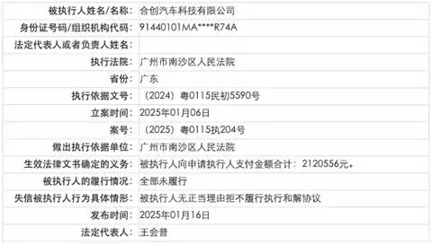 16日,广州南沙区人民法院将合创汽车列为失信人,原因是拒不履行200多万元的判罚金额。