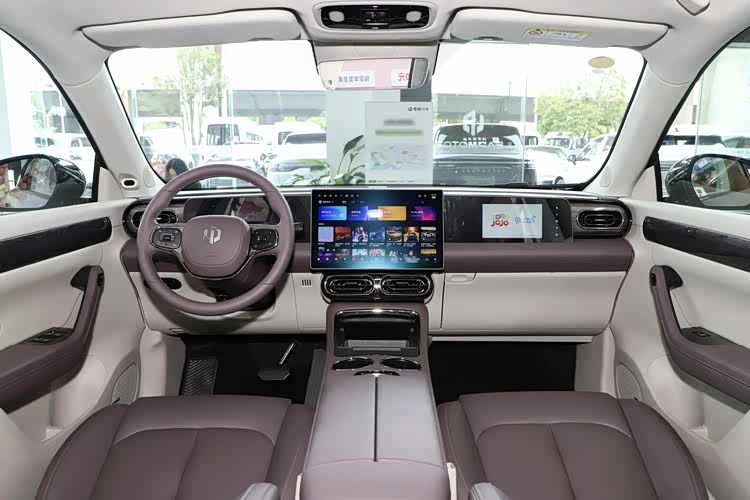 内饰设计以简约温馨为主基调,整体风格现代且富有科技感。两幅式多功能方向盘造型简洁,搭配电子怀挡设计,不仅操作便捷,还释放了中控区域的空间。梯形中控台布局规整,最引人注目的是横向整齐排布的三块大屏:10.2寸液晶仪表盘显示清晰;14.6寸中控屏采用2.5K OLED材质,色彩鲜艳、触控流畅;10.25寸副驾驶屏则为乘客提供了专属的娱乐体验。三屏联动不仅提升了科技感,还让车内氛围更加智能化。面部识别和连续性语音识别控制系统让操作更加便捷高效,而高通骁龙8295P芯片的加持,则为车机系统提供了强大的算力支持,确保流畅的运行体验。车内还配备了12个扬声器的高品质音响系统,支持K歌功能,为车内乘客带来了沉浸式的娱乐体验。