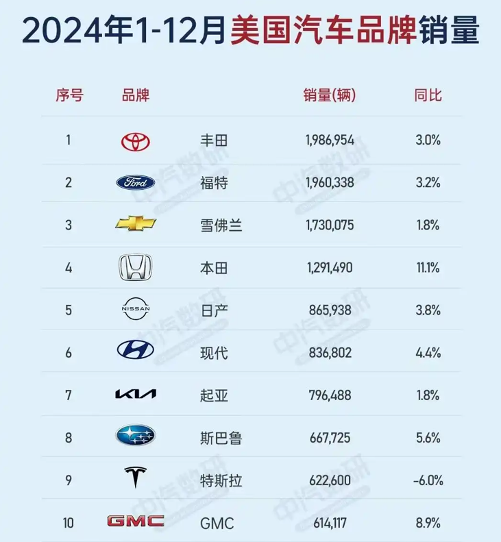 去年,美国市场销量排名前十的汽车品牌分别为丰田、福特、雪佛兰、本田、日产、现代、起亚、斯巴鲁、特斯拉、GMC。
