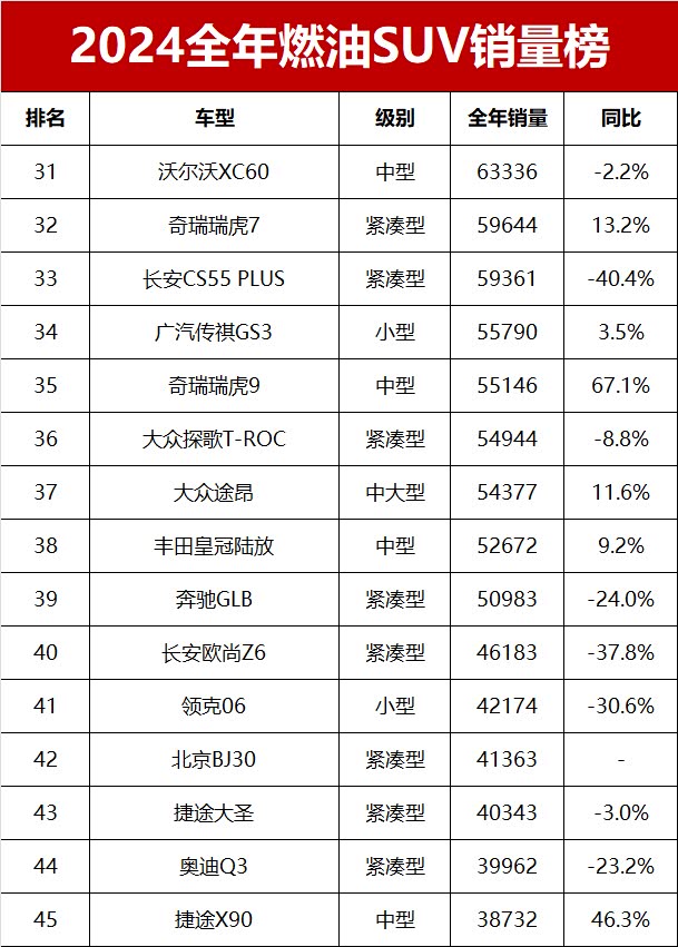 沃尔沃XC60成为二线豪华中型SUV中的佼佼者,2024年销量为63336辆,排名第31位。