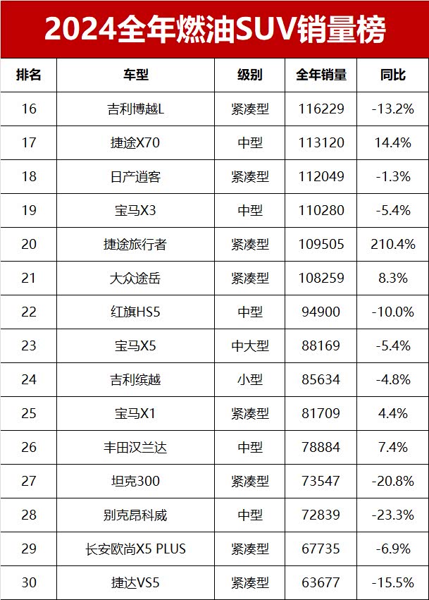 作为上年燃油SUV销量亚军的哈弗H6,2024年销量为132698辆,排名第13位。同样来自长城汽车的哈弗大狗累计销量118440辆,排名第15位。此外,吉利博越L、捷途X70的销量也超过11万辆,排名第16和第17位。