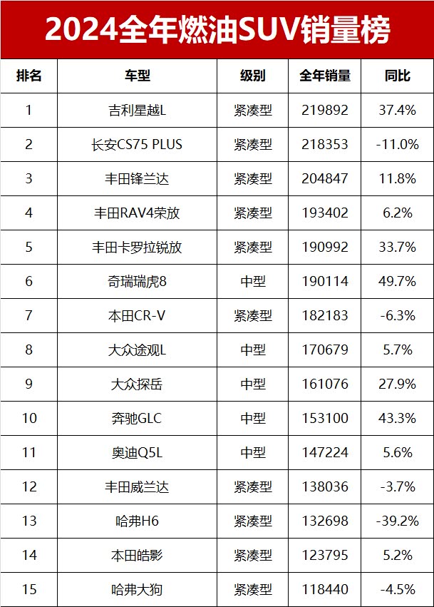 具体来看,2024年销量超过10万辆的燃油SUV共有21款车型,其中3款车型零售销量超过20万辆。吉利星越L和 长安CS75 PLUS(参数|询价)笑到最后,2024年分别以219892辆和218353辆的销量夺得燃油SUV销量冠亚军。