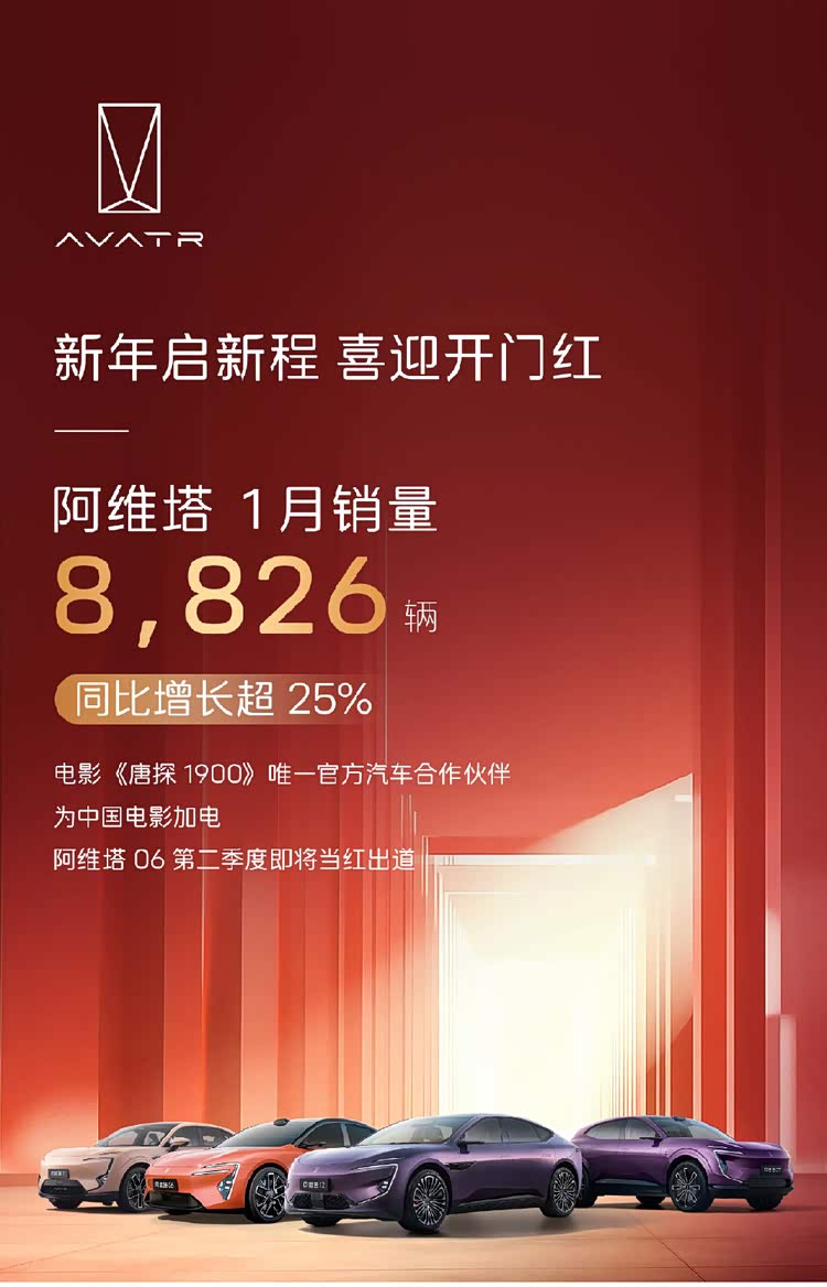 2月1日,阿维塔科技宣布,1月销量达8826辆,同比增长超25%,喜迎开门红。