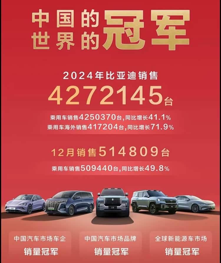 作为新能源市场断崖式领先的存在,比亚迪2024年销量再创新高,全年销量达到427.2万辆,其中乘用车销量达到425万辆,这一成绩不仅稳居中国乘用车市场销量榜首,比亚迪还超越了上汽,终结了上汽集团18连冠,成为了国内首个销量突破400万辆的自主汽车制造商。