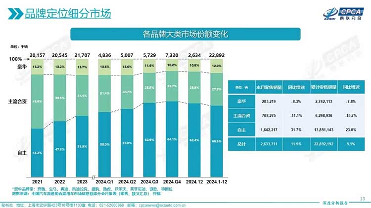 得益于比亚迪、吉利、奇瑞、长安等自主车企的强势增长,2024年自主品牌的发展也迎来了突破性的进步。