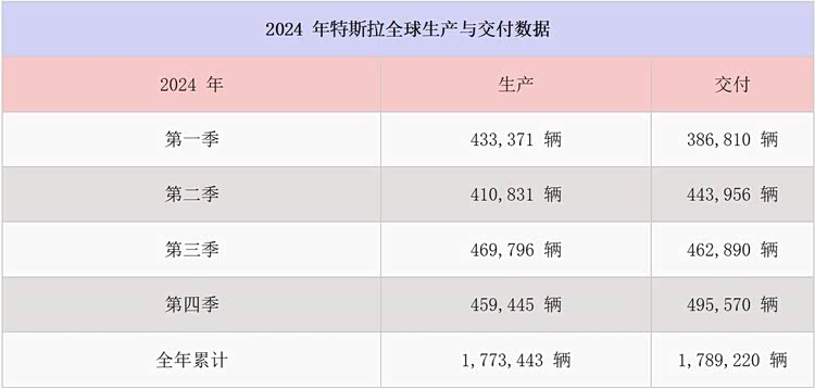 特斯拉先前公布其于 2024 年第四季新车生产量与交付销量、以及全年度数字,2024 年全年交付 178.9 万辆电动车、相比 2023 年的 180.8 万辆下滑 1.1%,也是品牌自 2011 年来首度年销下滑,纯电车年销量仅高出比亚迪的 176.8 万辆约 2.1 万辆,甚至全年生产量更略低于比亚迪达 177.7 万辆达 4,500 辆。2024 年第四季特斯拉交付的 49.5 万辆、更略逊于比亚迪的 59.5 万辆,让比亚迪连续 2 季都「超车」特斯拉成为电动车销售冠军。
