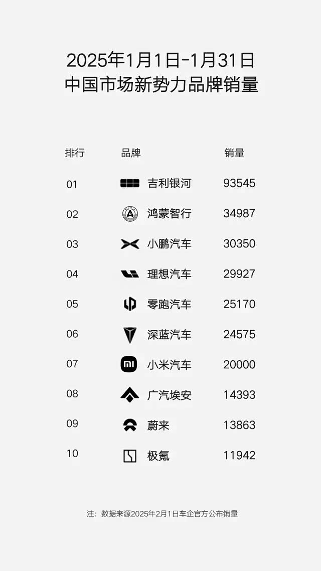 在新势力阵营里,银河以绝对领先的优势砍获了1月销冠,不仅超越了一直以来的新势力领头羊理想,其销量更是相当于鸿蒙智行、理想、小鹏三家当红车企的销量之和!以如此耀眼的成绩打出漂亮的开局,这不禁让我们对其接下来的表现充满期待。