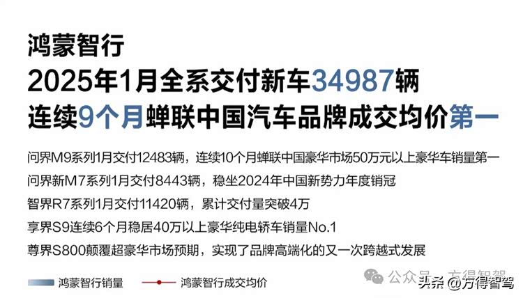 2025年1月包含春节,因此销量不算正常,但仍然可以看到一个趋势,那就是智驾第一梯队都有着不错的销量:鸿蒙智行、理想、小鹏、阿维塔等。可以预见,在2025年全年,这些品牌会被更多消费者青睐。