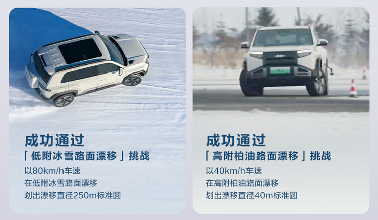 看了方程豹钛3的测试情况,这里有两个“漂移”,一个是“冬季低附路面漂移”,一个是“全球首次高附地面硬派SUV漂移”。前者是在牙克石中汽中心冬季极寒试验测试场进行的,后者是在高附地面进行的(标准柏油路面,漂移直径40m标准圆,车速40km/h)。两个漂移挑战都获得了中汽中心认证。
