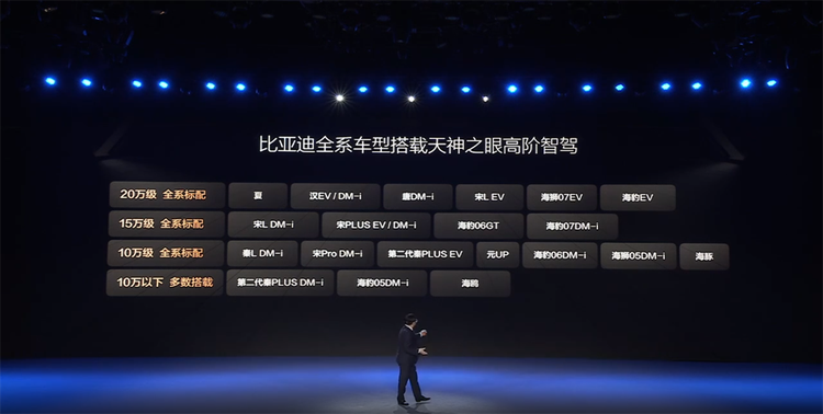 首先先来看看比亚迪目前的智驾系统体系,这套天神之眼智驾系统分为天神之眼A、天神之眼B、天神之眼C三种,其中天神之眼A主要搭载于仰望车型,天神之眼B则配备了激光雷达,支持城市领航等智驾功能,而本次发布会的重点则是最亲民的天神之眼C,这是一套纯视觉辅助驾驶系统,本次发布会大多数车型都采用这个配置。