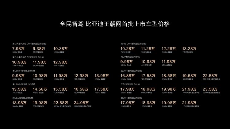 秦系列:第二代秦PLUS DM - i智驾版 7.98 - 10.38万;第二代秦PLUS EV智驾版10.98 - 12.98万;秦L DM - i智驾版9.98 - 13.98万。宋系列:宋Pro DM - i智驾版10.28 - 13.28万;宋L DM - i智驾版13.58 - 17.58万;宋L EV智驾版18.98 - 24.98万。元系列:元UP智驾版9.98 - 11.98万。汉系列:汉DM - i智驾版16.88 - 22.58万;汉EV智驾版17.98 - 23.58万。唐系列:唐DM - i智驾版17.98 - 21.98万。