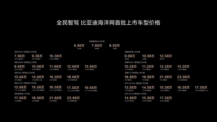 海豹系列:海豹05 DM - i智驾版7.98 - 10.38万;海豹06 DM - i智驾版9.98 - 13.98万;海豹07 GT智驾版13.68 - 18.68万;海豹07 DM - i智驾版13.58 - 19.58万;海豹智驾版17.98 - 23.98万。海鸥系列:海鸥智驾版6.98 - 8.58万。海狮系列:海狮智驾版9.98 - 12.58万。海豚系列:海豚05 DM - i智驾版10.28 - 13.28万;海豚07 EV智驾版18.98 - 23.98万。宋系列:宋PLUS DM - i智驾版13.58 - 17.58万;宋PLUS EV智驾版14.98 - 17.58万。