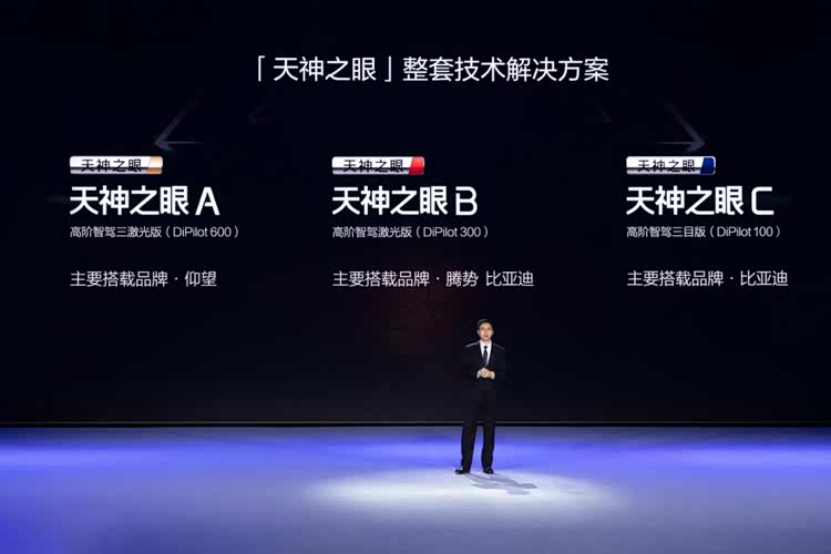 比亚迪天神之眼共包含三套技术方案:天神之眼 A - 高阶智驾三激光版(DiPilot 600)、天神之眼 B - 高阶智驾激光版(DiPilot 300)、天神之眼 C - 高阶智驾三目版(DiPilot 100)。天神之眼 A主要应用在仰望,天神之眼 B主要应用在腾势及比亚迪品牌,天神之眼 C则搭载在比亚迪品牌。