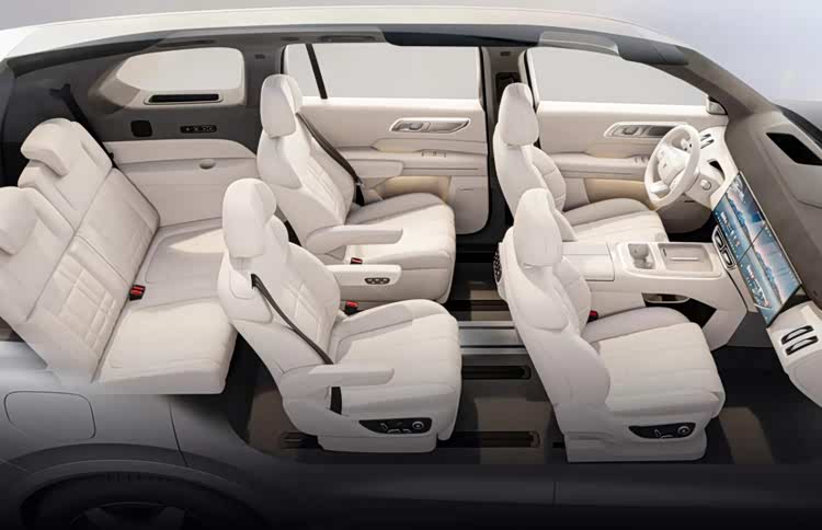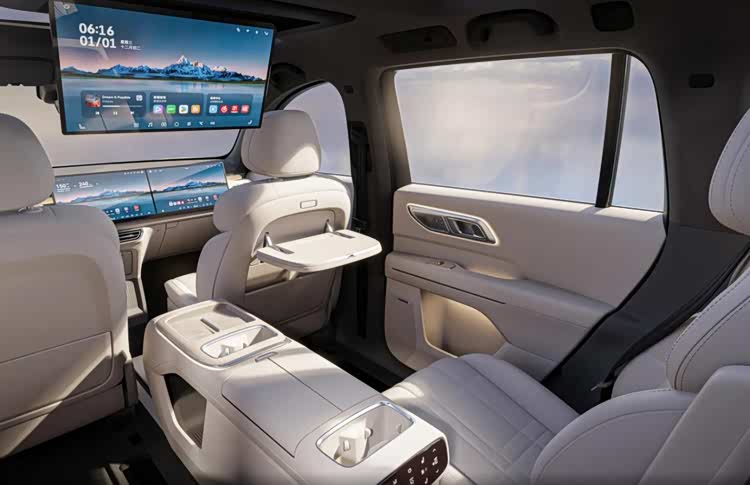 深蓝S09的前排座椅带有通风、加热、按摩功能,二排座椅采用独立设计,扶手的内侧安装了控制按键,可以设置通风、加热、按摩,右后座前方还带有小桌板,后排彩电也没有落下,采用21.4英寸的吸顶屏,分辨率为3K。但尺寸和分辨率都不如领克900,后者的吸顶屏尺寸达到30英寸,分辨率为S09的一倍,达到6K。