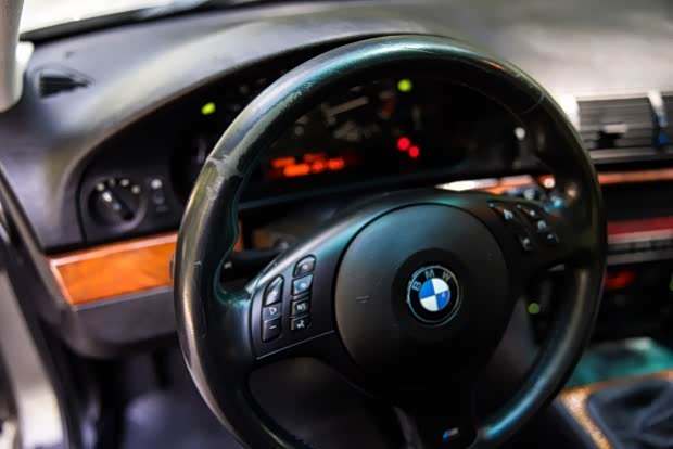 25年过去了,“天使眼”的犀利目光依旧摄人心魄,而初次相遇的画面仿佛刻进了记忆深处。夜幕下,远处的车库一角,氙气灯光勾勒出修长优雅的身影,熟悉的天使眼光环静静地亮着。微风拂过,隐约能听见直列六缸发动机低沉的律动。这是一台已经行驶了33万公里的宝马E39 M5,但它的内饰依旧保留着当年的精致与质感。