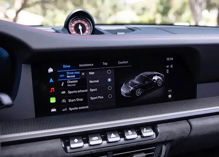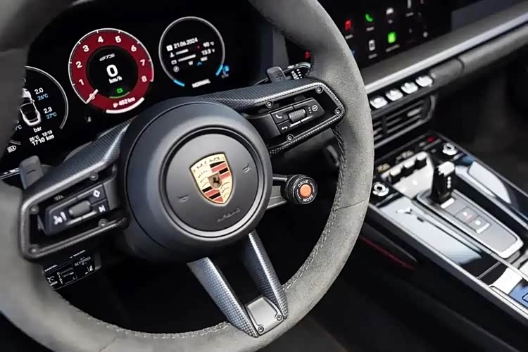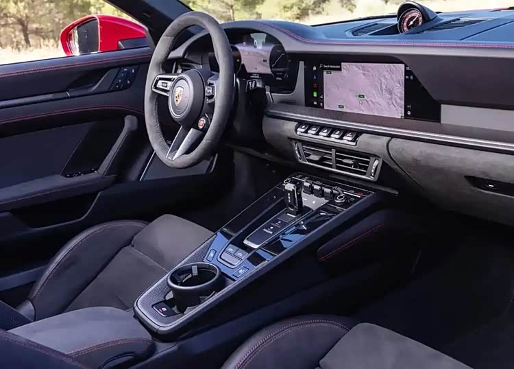 尽管车内的总体设计保持不变,但911车型在方向盘的左侧首次显示了启动按钮。12.6英寸的仪表盘是一种全数字化的组合仪表,允许用户自定义视角,提供多达七种不同的设计选项,其中包括一块独特的经典显示屏,这一设计灵感来源于传统的五圆保时捷表盘和中央转速表。