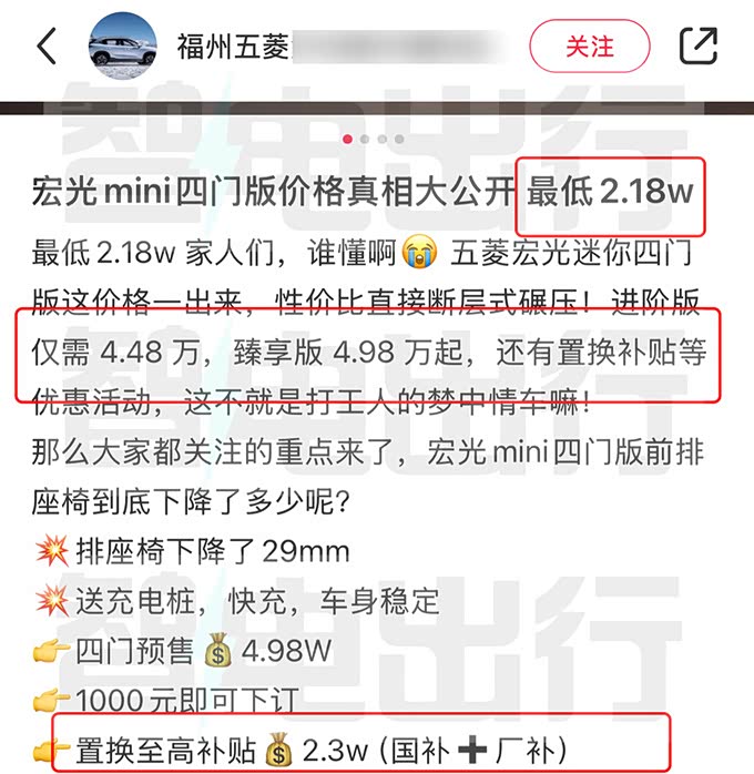 销售表示,新车预售价4.48万、4.98万,旧车置换补贴+厂补直降2.3万,最低2.18万就能落地。