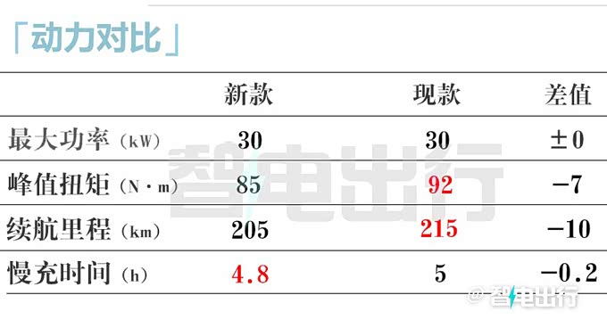宏光MINIEV四门搭载30kW三合一电驱系统,峰值扭矩85N·m。匹配16.2kWh磷酸铁锂电池,CLTC续航里程205km,直流快充时间35分钟(电量30%-80%),慢充时间4.8小时(电量20%-100%)。