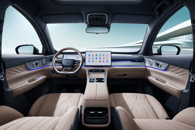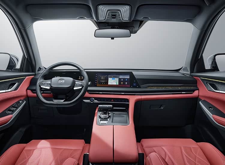 内饰上采用了全新环抱式座舱,配备15.6英寸2.5K中控屏+10.25的液晶仪表,车机芯片采用高通骁龙8155芯片,支持语音助手、Carplay/HUAWEI、HiCar手机互联,64色双氛围灯和时尚木纹饰板也进一步提升了视觉上的精致感。