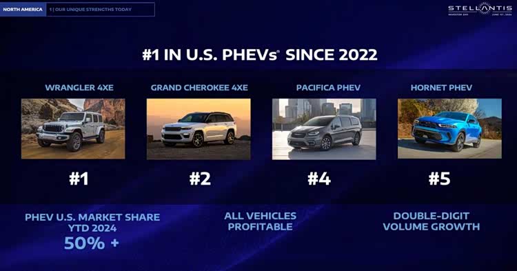 近年来唯一亮眼的产品是PHEV 4XE,2024年4XE车型销量大约在17万台,占据品牌销量26%,FCA借此也占据了北美市场40% PHEV车型的销量。