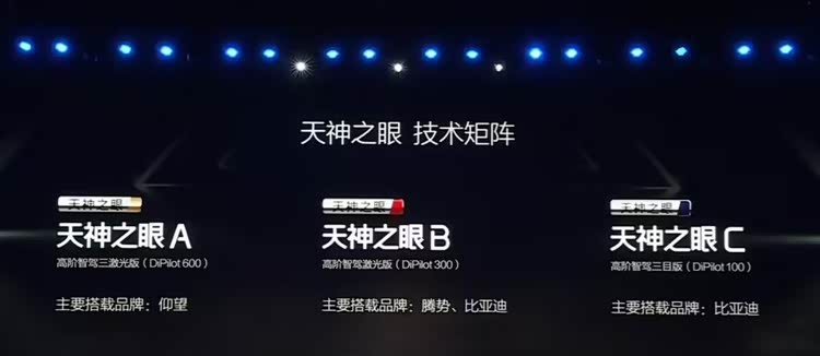 天神之眼A目前专用于仰望品牌,如仰望U8豪华SUV。天神之眼B适配腾势品牌和比亚迪的豪华车型,比如20万级的汉EV、 唐DM(参数|询价)-i等。天神之眼C覆盖比亚迪全系经济车型,包括7万级的海鸥智驾版(6.98万起)。10万级的秦PLUS DM-i、宋Pro DM-i等。