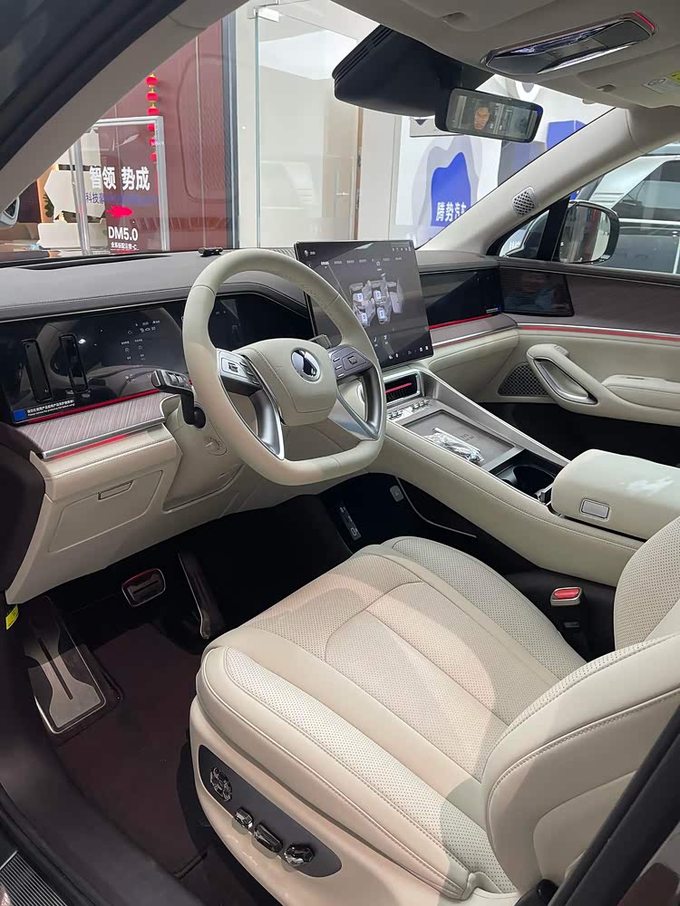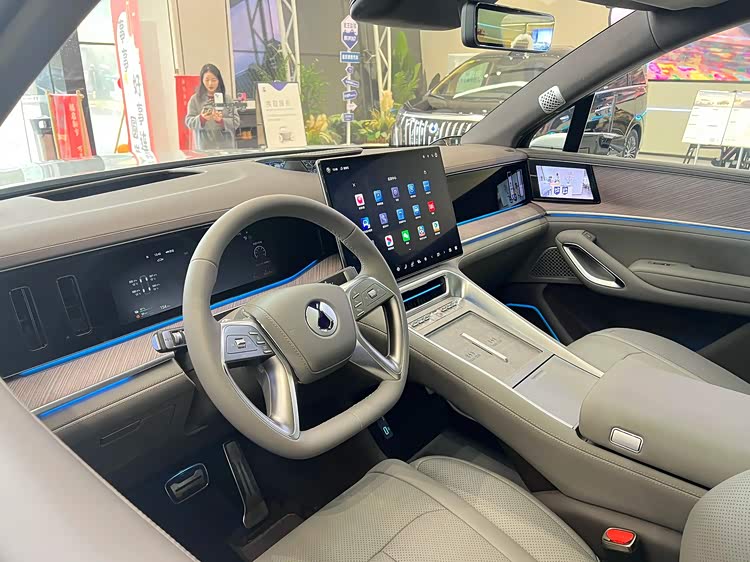 当你步入腾势N9的汽车内部,你会立即感受到一种浓烈的科技气氛。在中控台的两侧,13.2英寸的全液晶仪表盘和副驾娱乐屏被对称地嵌入其中,再加上17.3英寸的悬浮式中控屏和50英寸的AR-HUD抬头显示,为驾驶者带来了一种全方位的视觉享受。车辆内部普遍采用真皮作为主要的装修材料,并与木纹装饰板以及氛围灯相融合,共同营造出一种奢侈而又舒适的驾驶和乘坐环境。配备了四辐式多功能方向盘、电子怀挡、水晶装饰以及双50W手机的无线充电功能,这些都进一步提升了车辆的高级感。