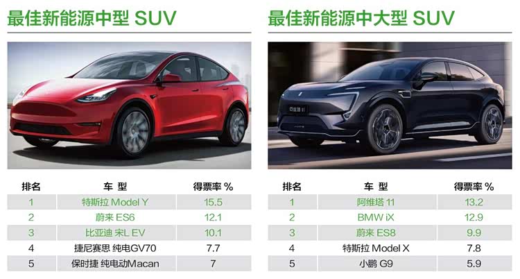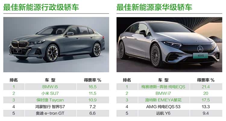 BMW i5、梅赛德斯-奔驰纯电EQS以16.5%和21.4%的得票率,分别获得“最佳新能源行政级轿车”与“最佳新能源豪华级轿车”的奖项,展现出了传统豪华品牌在新能源转型上的成果,并依旧在豪华市场定位中占有领先优势。