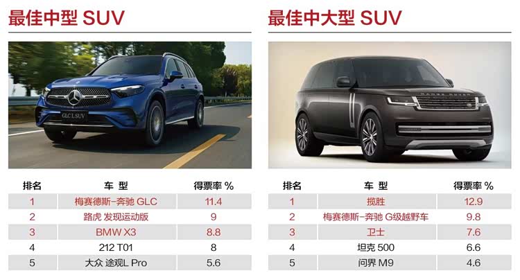 梅赛德斯-奔驰GLC以11.4%的得票率获得“最佳中型SUV”奖项,凭借其超40%的年度同比交付增长,智能化表现大幅提升更获得消费者认可,继续保持自身领先位置。如果要找一款梦想SUV座驾,或许揽胜的名字一定会出现在很多人的清单列表中,12.9%的得票率使它获得了“最佳中大型SUV”的奖项认可,尤其是在高端豪华SUV市场中,揽胜凭借强大品牌影响力和竞争力,始终是这一市场的标杆表现。