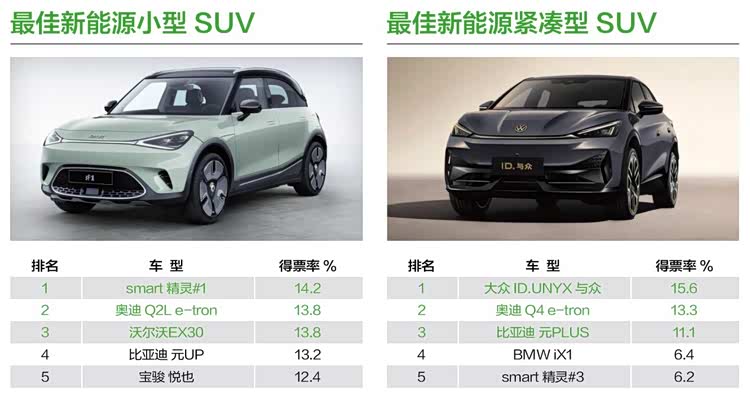 smart精灵#1以14.2%得票率获得“最佳新能源小型SUV”奖项。对于smart品牌而言,2024年绝对算是十分“忙碌”的一年,不仅推出了全新车型,更投身于海外市场,开展全球化品牌的战略,而精灵#1也迎来了配置上的升级,可爱造型更讨年轻人喜欢。ID.UNYX与众的登场,则让人们看到了一个与众不同的“大众”,作为大众首款智能电动轿跑SUV,轿跑溜背造型、IQ. Drive全旅程智驾系统、丰富车载娱乐生态以及德系一贯出色的驾控体验,并15.6%得票率获得“最佳新能源紧凑型SUV”的认可,含“金”量十足。