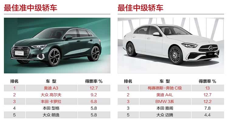 奥迪A3以12.7%的得票率获得“最佳准中级轿车”奖项,展现出自身强大实力的同时,更以“年轻人第一台豪华车”的形象引领年轻化趋势,满足消费者多元化的用车需求。梅赛德斯-奔驰C级以13%得票率力压奥迪A4L和BMW 3系获得“最佳中级轿车”奖项,面对同级竞争激烈的市场环境,凭借口碑认可占得先机,彰显其自身独特价值。